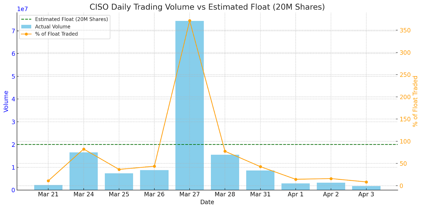 On March 27 alone, CISO traded over 74 million shares. That’s roughly 370% of the estimated float of 20 million shares. In fact, over the past two weeks, the average trade size has often been exactly 1 share. Not a few times. Thousands. The sad truth is that those 1-share trades are likely fractional 0.1 share trades meant to push the price down.
